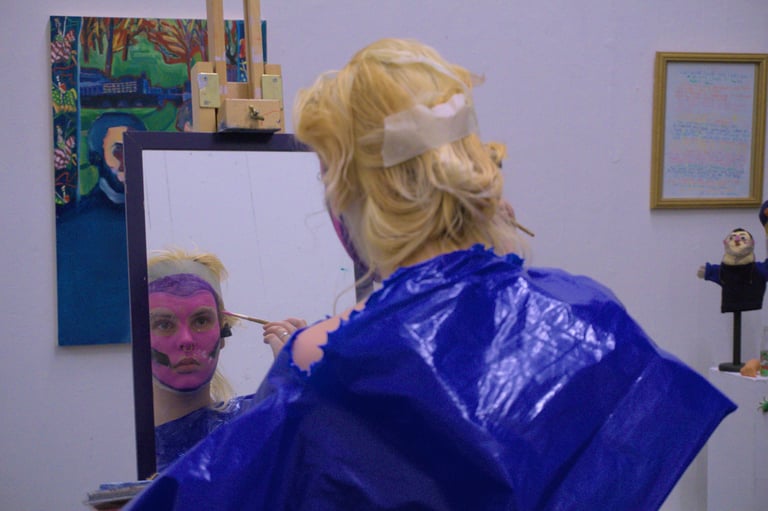 After being prompted for the umpteenth time that -I really should look into sculpture as a way to immortalise (and legitamise) my drag performances- I just decided to put myself in an exhibition. I had an easel to hold my mirror and a plinth to sit on while I applied it & I did my best to keep a straight face and ignore punters watching me. Afterwards I joined the evenings lineup of performance work & lipsynced to Pig by Sparklehorse - a song I had been using for other drag work at the time.